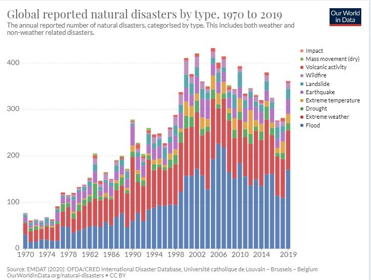 Come dimostra questo grafico di Our World in Data i disastri naturali sono molto aumentati negli ultimi decenni.