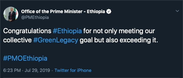 Tra le varie iniziative che hanno caratterizzato la sua attività politica ne troviamo una in particolare che ha riscosso l’interesse del mondo ambientalista. Come già riportato qualche mese fa, lo scorso 29 luglio in Etiopia sono stati piantati 353 milioni di alberi in meno di un giorno con lo scopo di far fronte all’avanzamento dello stato di desertificazione dei terreni che sta colpendo l’Africa a causa, neanche a dirlo, dei cambiamenti climatici. Un’ulteriore riprova di come sia cruciale al giorno d’oggi abbinare delle politiche ambientaliste di rilievo a qualsivoglia provvedimento possa venir preso in ambito economico o sociale.